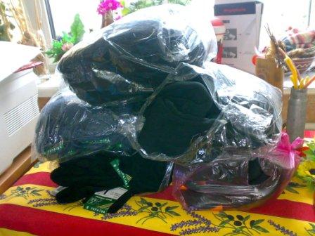 ..до пакунку ввійшли: панчохи, тепла шапка в"язана, окуляри "тактичні", спальник, каримат, теплі в"язані перчатки та шкіряні напівперчатки, светер, куртка, наколінники, шолом та бронежилет, шампунь, та дуже скромний набір до аптечки з бинтів та ентересгелю. Як додаток, кіло меду в пластиковому відерку і все це помістили в натовський армійський рюкзак...